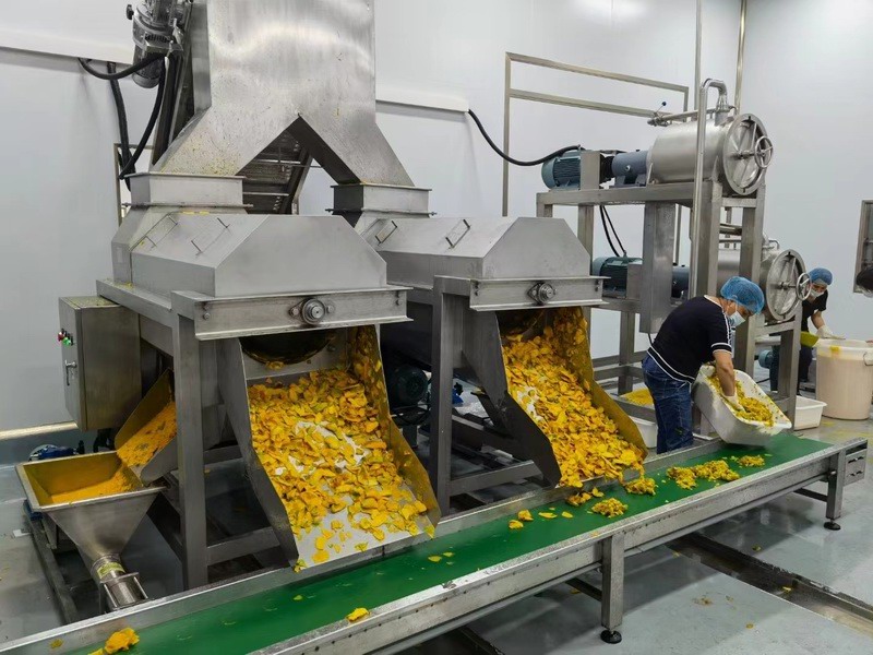 4.用帶式榨汁機(jī)處理菠蘿來提高出汁率、用去皮去核打漿機(jī)來完成芒果的取汁。